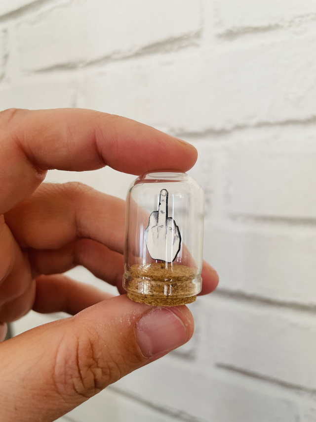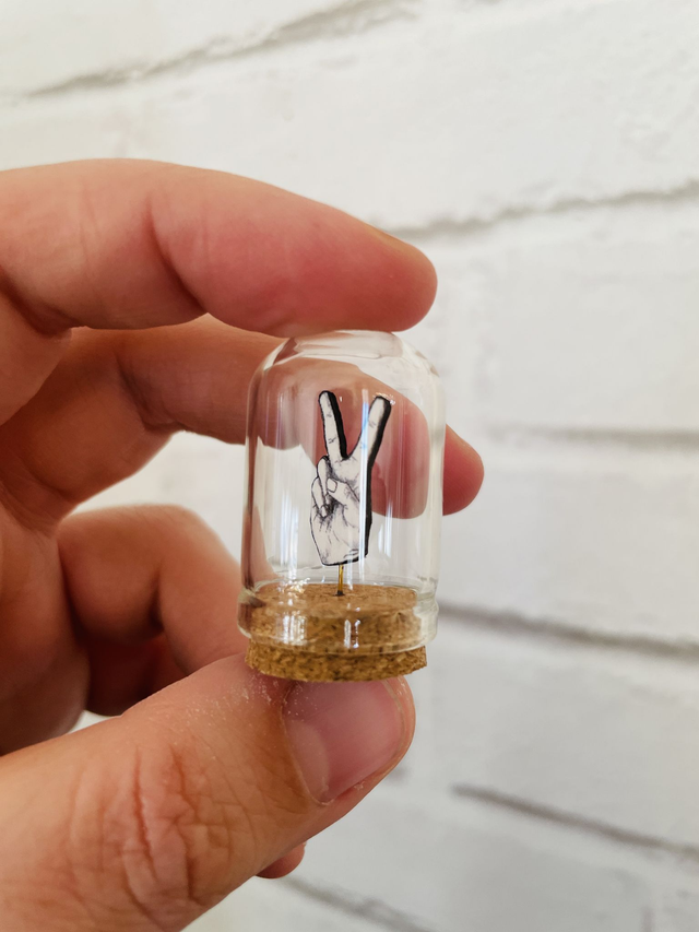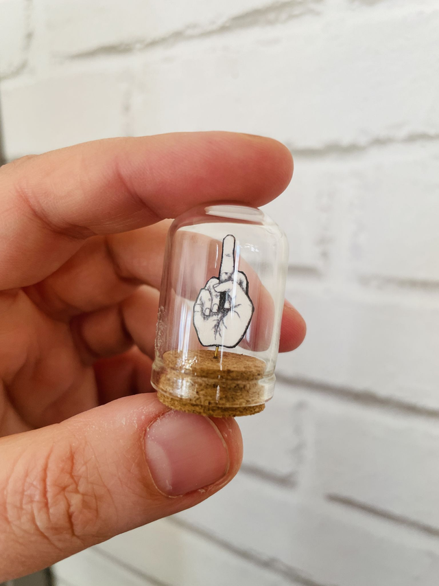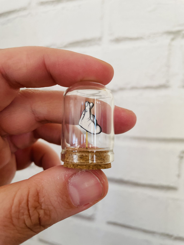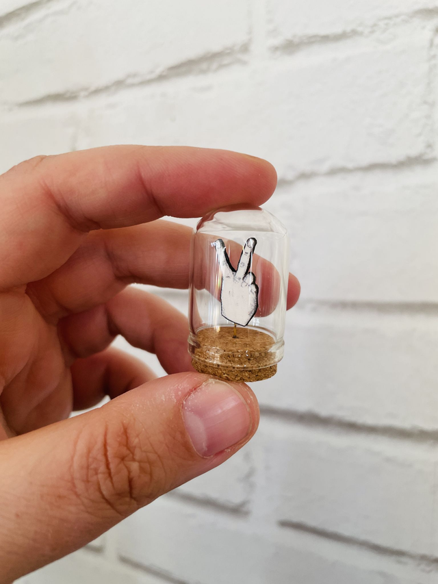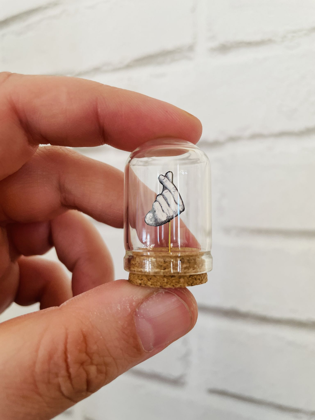 L’ensemble est composé d’une main illustrée dans une mini fiole en verre. Les mains sont imprimées et découpées manuellement puis collées pour être installée sur sa tige en métal doré.