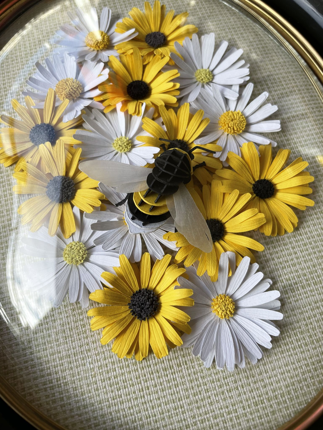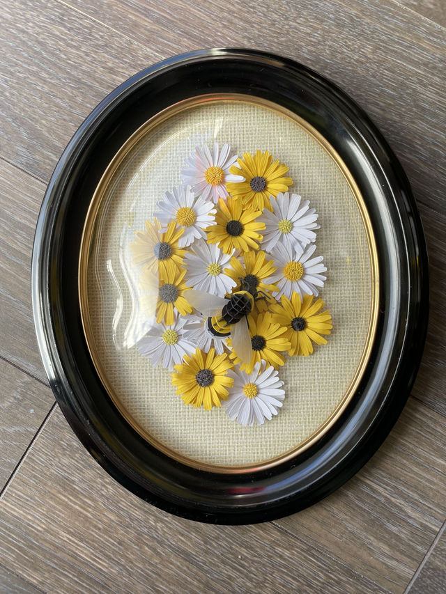L’ensemble est composé d’un bourdon et de fleurs en papier épais colorés, découpé mécaniquement et ajusté manuellement.